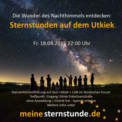 02.05.2025Der 30 Meter hohe „Utkiek“ ist die höchste Oldenburger Erhebung. Es ist eine ehemalige Mülldeponie, die vor ca. 10 Jahren stillgelegt wurde. Hier sind gute Bedingungen zum Sterne schauen, vor allem in östlicher Richtung gibt es nur wenig Lichtverschmutzung. Wir trafen uns Freitag abends fünf Mal, spazierten nach oben und gingen anschließend ins benachbarte Yezidische Forum für eine Nachbesprechung. Es kamen jeweils ca. 10-15 Personen. Am letzten Abend war der Himmel bedeckt, also blieben wir bei den Yeziden und betrachteten den Himmel per Planetariumssoftware.