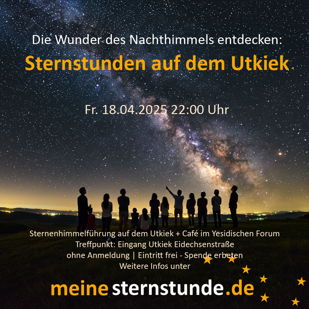 02.05.2025Der 30 Meter hohe „Utkiek“ ist die höchste Oldenburger Erhebung. Es ist eine ehemalige Mülldeponie, die vor ca. 10 Jahren stillgelegt wurde. Hier sind gute Bedingungen zum Sterne schauen, vor allem in östlicher Richtung gibt es nur wenig Lichtverschmutzung. Wir trafen uns Freitag abends fünf Mal, spazierten nach oben und gingen anschließend ins benachbarte Yezidische Forum für eine Nachbesprechung. Es kamen jeweils ca. 10-15 Personen. Am letzten Abend war der Himmel bedeckt, also blieben wir bei den Yeziden und betrachteten den Himmel per Planetariumssoftware.